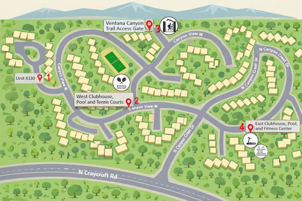 Complex Location - There is only one entrance to the complex. From Craycroft Road turn into the complex at North Canyon Crest Drive. When you come to a four-way intersection, take an immediate left toward "West Canyon View". Proceed up the hill and take the fourth left turn.